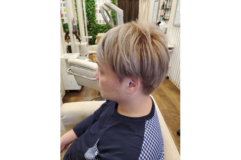 高田馬場のメンズに人気のヘアースニックのハイトーンカラーのお客様 ミルクティーカラー